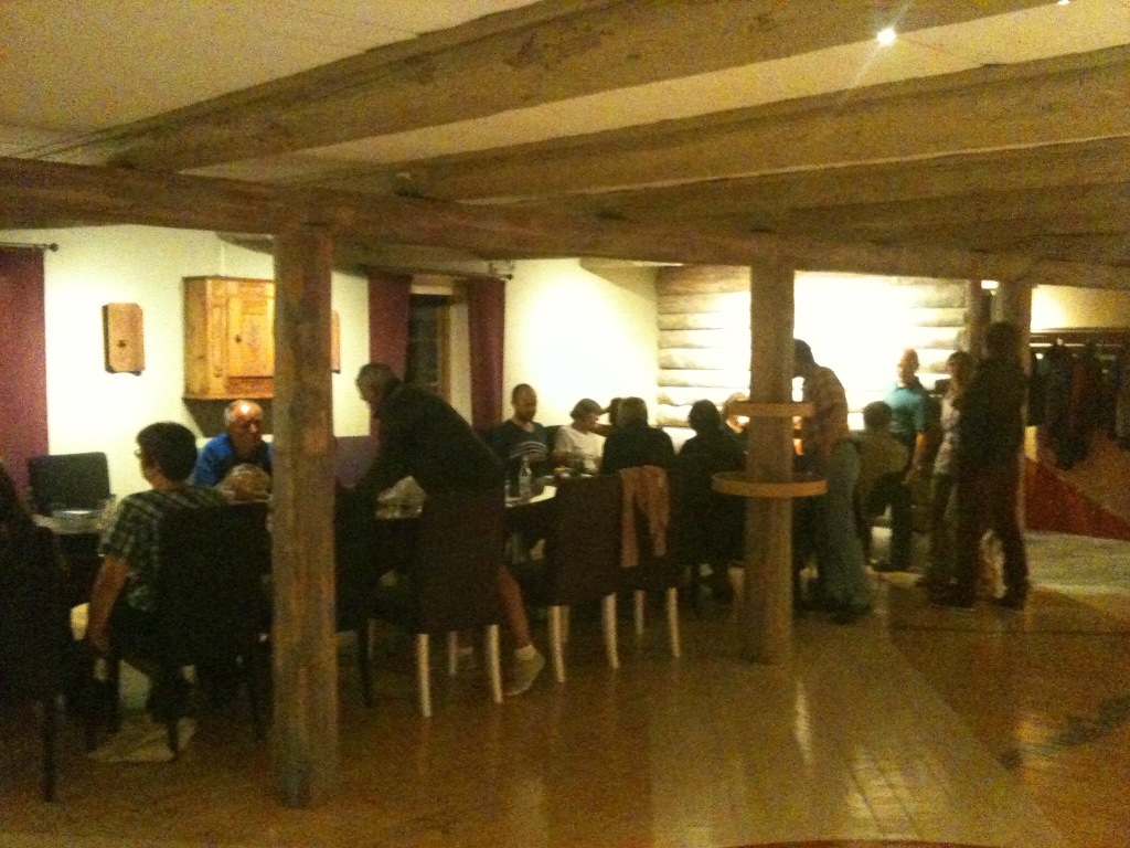 Jetzt sitzen wir – nach dem Abendbrot und kreisendem Rotwein – in gemütlicher Runde satt und trocken in der gleichen Lobby.