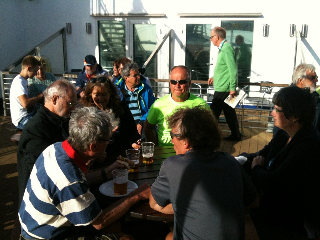 Jetzt sitzen wir auf dem Sonnendeck bei Bier und Würstchen.