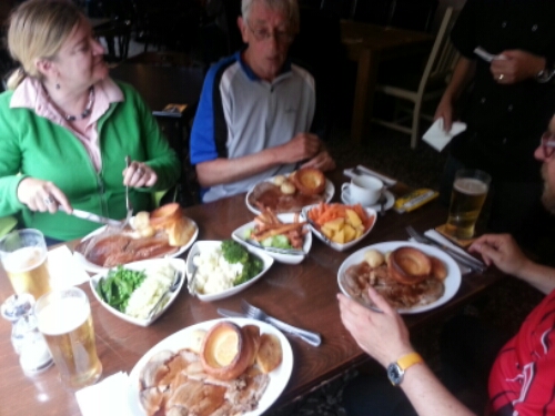 Fast 30 km sind wir trockenen Reifens voran gekommen. Kurz vor unserer Mittagspause mussten wir dann doch das Regenzeug auspacken. Jetzt sitzen wir aber erst einmal im Horse & Groom und schlemmen ein leckeres Mitagessen.