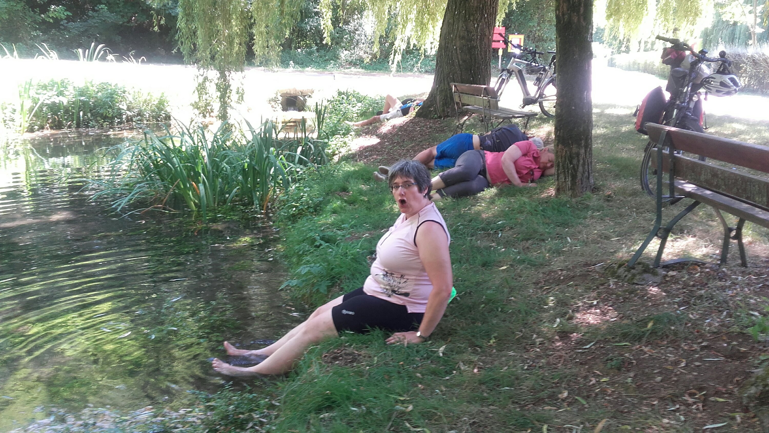 Da wir viel Zeit haben machten wir eine ausgiebige Trinkpause an einem Picknickplatz wo gerade eine Feier stattfand. Jetzt sind wir an einem Quellgebiet und halten Mittagsschlaf. Zum Wachwerden einfach die Füsse ins kalte Quellwasser stellen.
