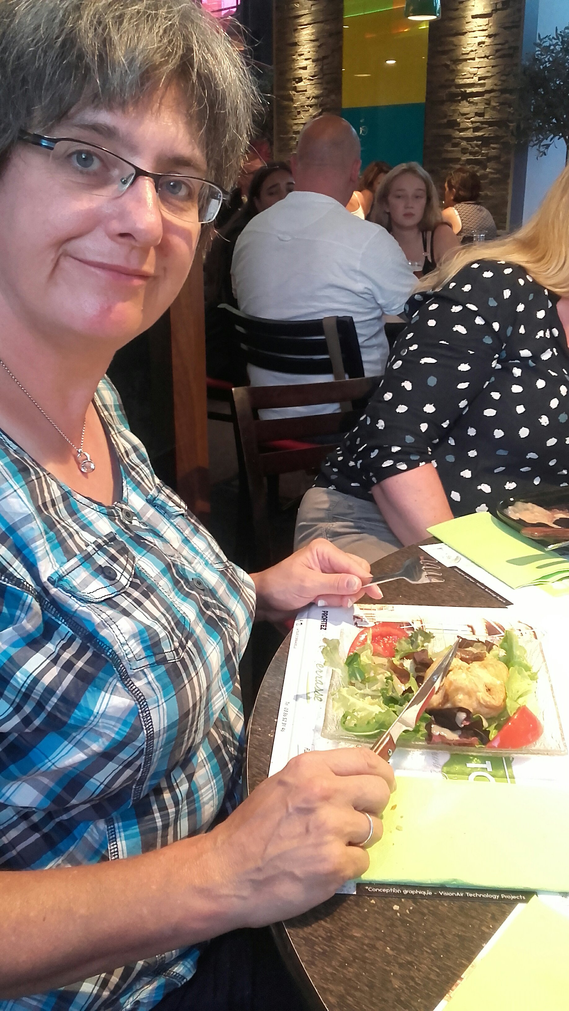 Heute Abend essen wir in der Restaurantkette „La Tour“. Der Sirop Citron erweist sich schon mal als geschmacksneutral. Sowohl im Bier als auch im Wasser. Das Menu de Jour (Viande ou Poisson) ist ein Überraschungsmenu. Allerdings lief die Bestellung schief, es gab für die Fischesser zunächst nur die Plate de Jour. Nicht gerade abendfüllend. Monika hat noch mal auf Menu aufgestockt.
